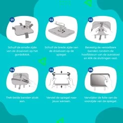 De bedoeling van deze spiegel is dat je deze aan een van de hoofdsteunen op de achterbank bevestigd, zodat jij via je achteruitkijkspiegel in de spiegel kijkt. De spiegel is in no-time te bevestigen door de handige banden die ook nog eens verstelbaar zijn. Bovendien kun je de spiegel bevestigen aan elke autostoel zonder vaste hoofdsteun.