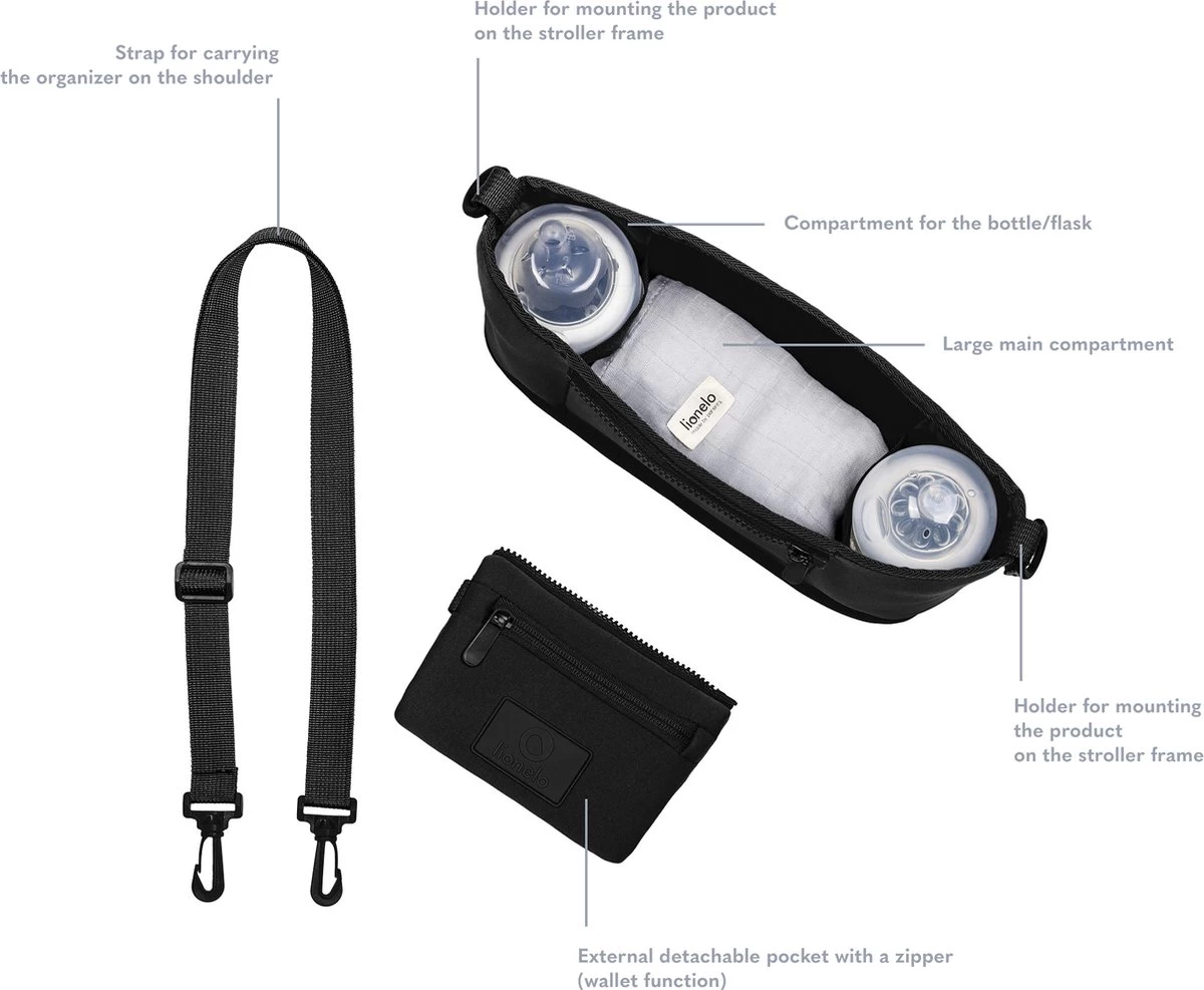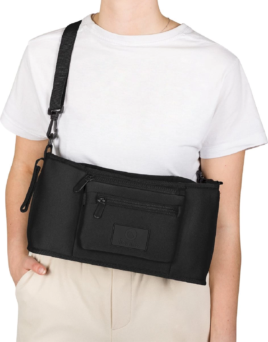 Hiermee heb je alle benodigde items bij de hand, zelfs als je niet in de buurt van de kinderwagen staat. Comfortabel opgehangen over de schouder, de organisator is perfect om te lopen.
