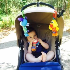 Maak kennis met dit rinkelende trio buggyspeeltjes. De vogel, koe en hond zijn ideaal voor de doorkomende tandjes, ze helpen met het kalmeren van pijnlijk tandvlees. De felle kleuren en bel-/rattel geluiden zullen uw kleintje onderweg zeker bezighouden! Deze drie vriendjes zijn eenvoudig te bevestigen aan kinderwagens, buggy’s, auto- of wipstoeltjes.