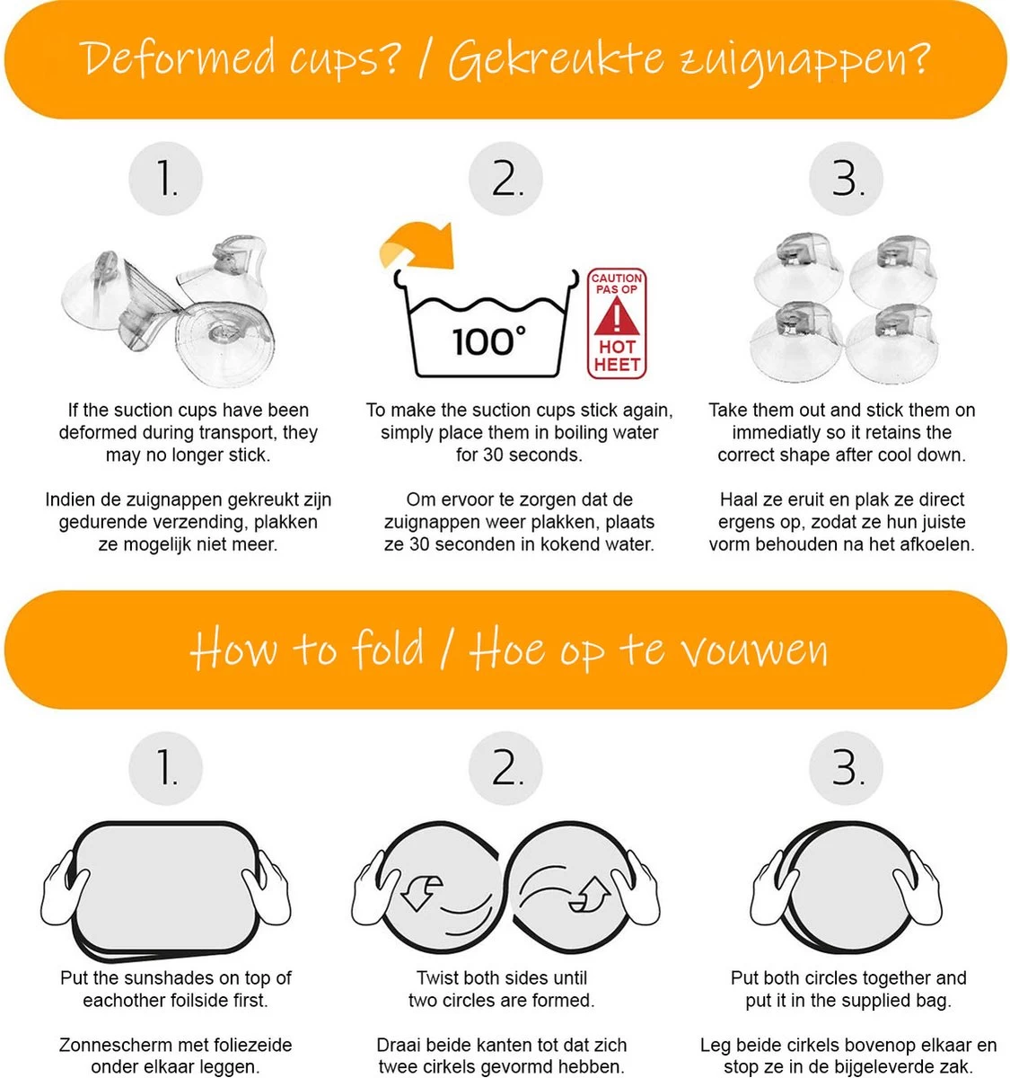 - Makkelijk te bevestigen: Het zonnescherm voor je baby wordt met zuignappen op de autoruiten bevestigd en kan zonder resten achter te laten weer worden verwijderd.